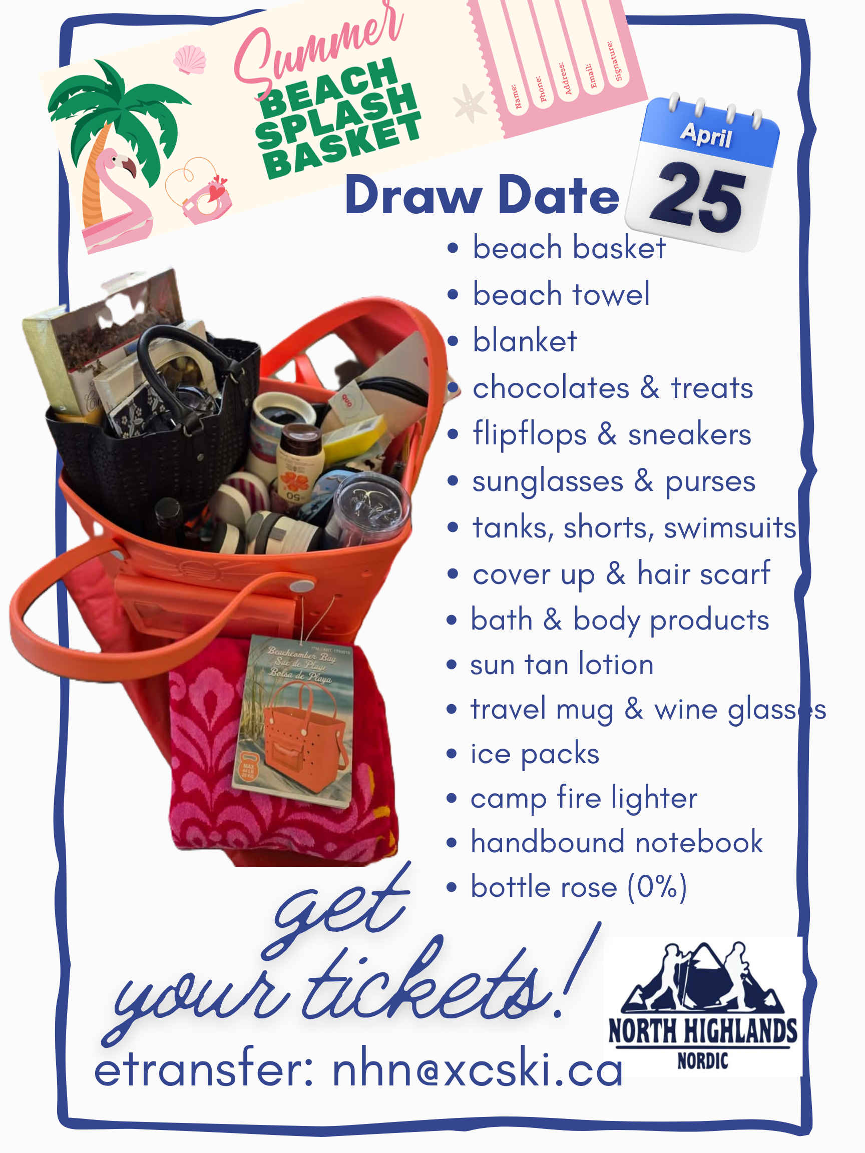tickets for the SUMMER BEACH SPLASH BASKET 1 for $5 or 3 for $10 available for purchase by e-transfer nhn@xcski.ca or in person at Saturday Breakfast.